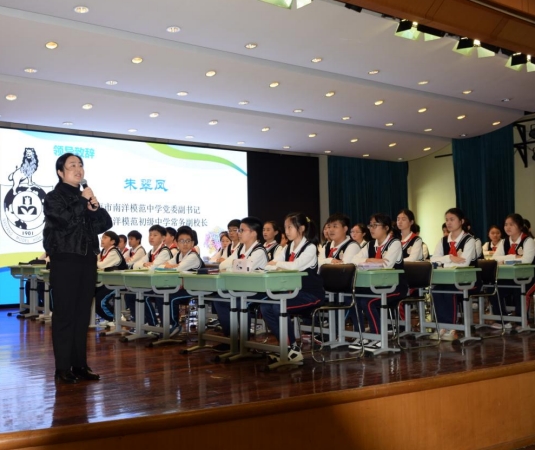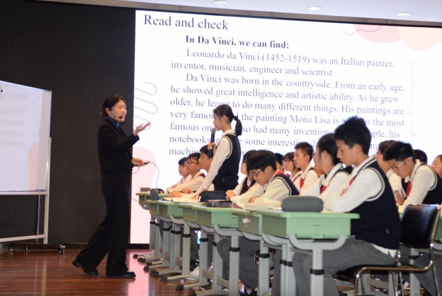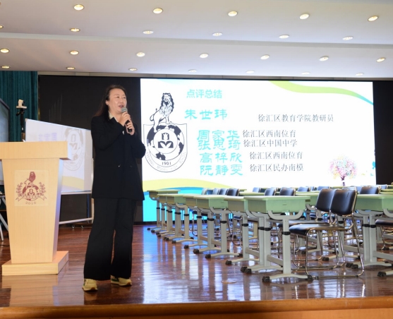 2023 年 11 月 22 日下午 12:50,由徐汇区教育学院课程教学研修中心主办、 上海市南洋模范初级中学承办,徐汇区初中英语学科主题教研活动——“双新背 景下的学习与评价变革”之“基于语篇解读的低高年级阅读教学设计”在南洋模范初 级中学艺体楼大礼堂拉开帷幕。本次主题教研活动由南模初级中学英语学科教研 组长刘金老师主持,徐汇区七年级和八年级百余位老师参加了本次主题教研活动。 首先,上海市南洋模范中学党委副书记、上海市南洋模范初级中学常务副校 长朱翠凤女士为本次活动致辞,她向在场专家和老师介绍了南模初中英语教研组 的整体情况,称赞这是一个充满凝聚力和科研精神的教研组,并对南模初中英语 教研组提出殷切期望。 接下来,本次活动呈现了两节展示课。第一节课是由马诗雯老师带来的七年 级第一学期第七单元的阅读课 Signs around us。她充分把握本课时中对话语篇 的结构特征,带领学生理解标志的不同含义,并创设了注重实践运用与迁移创新 的活动,帮助学生在真实情境中运用所学语言和文化知识解决实际问题。第二节 课是由余汇杰老师带来的八年级第一学期第五单元 Encyclopedias 的阅读课 Look it up!。她带领学生观察主题,了解综合性百科全书特征,帮助学生剖析内 容,体会百科全书的真实性,并采用 KWL 教学策略,将未知转化成已知,且熟 练运用组织图形,注重知识结构化的过程。 随后,来自徐汇区西南位育的周家华和高梓欣老师,来自徐汇区中国中学的 张思琦和民办南模和阮静雯老师先后分享了自己的观课感受,并就本次活动主题 分享了自己的理解和感悟。 最后,徐汇区教育学院教研员对两节课进行了点评,赞扬了两位执教青年教 师和四位现场发言的青年教师们的精彩表现,对在双新背景下“教-学-评”设计上 的“蜕变”更是给予了高度肯定。同时朱老师也提出,青年教师的良好发展关系着 徐汇英语的未来,希望将来有更多的青年教师勇敢地站出来,主动寻求发展,抓 住每一次机会,获得更快的进步。